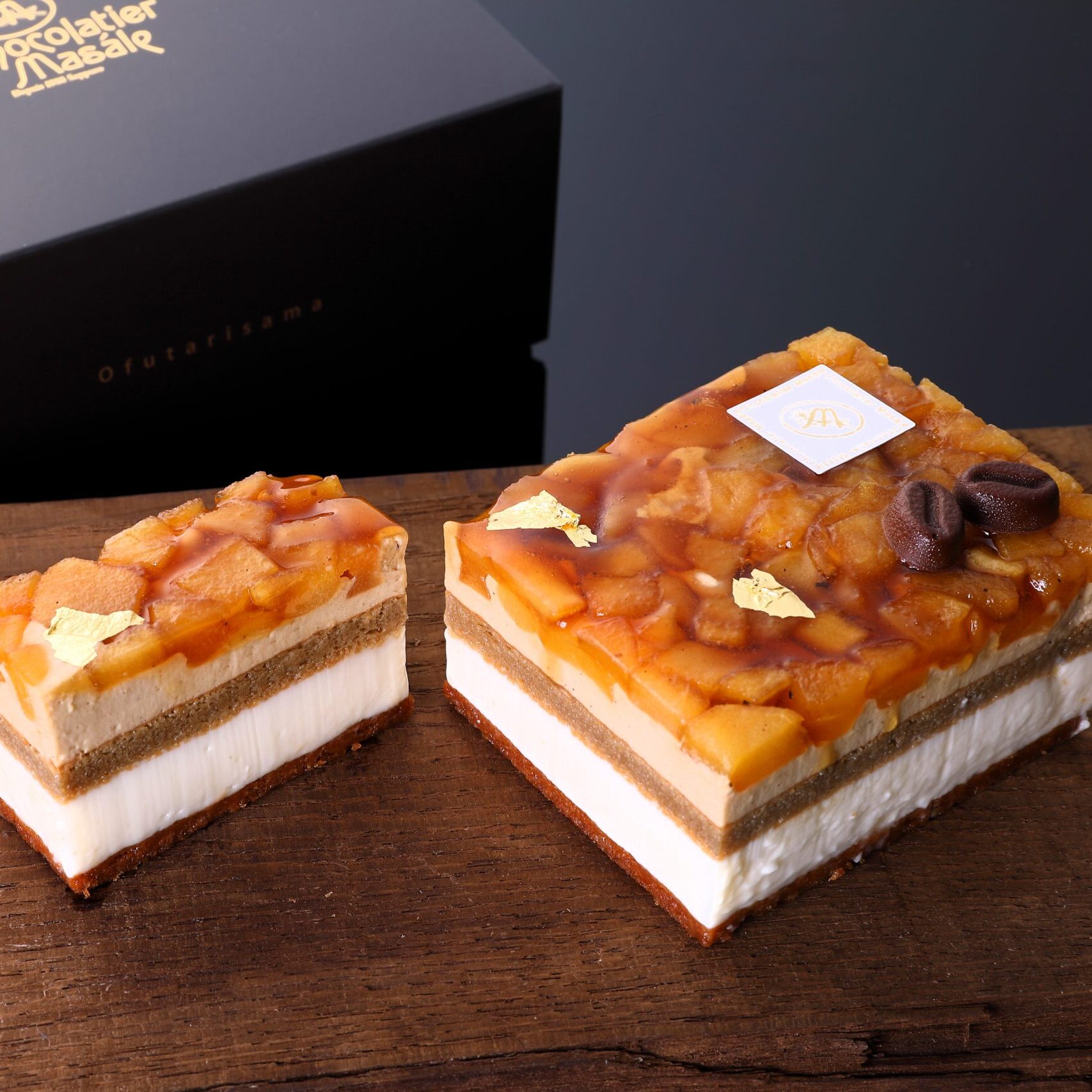 レアチーズと焙煎珈琲ムース。キャラメリゼしたリンゴや甘い香りのサブレ生地のコクと果実味を感じるケーキ。