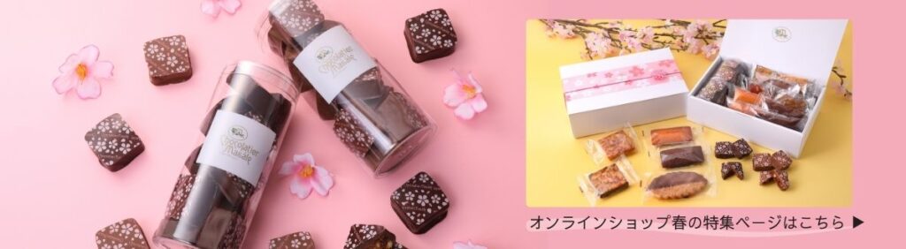 桜デザインのショコラブラウニーやイチゴのリーフパイなど、春の贈り物にぴったりの華やかなギフトなどを多数取り揃えております。